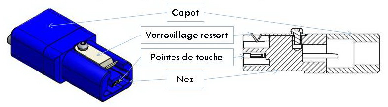- D’un capot : Il assure la protection de l’arrière de la pointe de touche et le maintient de la gaine de protection des fils électriques.